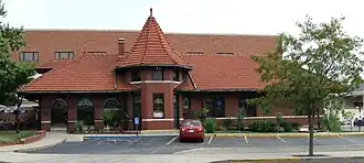 The Columbia station, also known as Missouri, Kansas, and Texas Railroad Depot or Katy Station, was built in 1909 by the Missouri–Kansas–Texas Railroad in downtown Columbia, Missouri. The station was one of two train stations serving Columbia in the 20th century, the other being the Wabash Railroad Station and Freight House constructed the same year.[2][3] The building is the terminus of the MKT Trail, a rails-to-trails project that was built on the former spur of the railroad. Having housed a popular local restaurant named "Katy Station" after the building, it now houses a bar name "Shiloh's."[4]