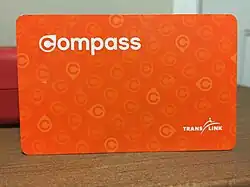 The Compass card is a contactless smart card automated fare collection system used primarily for public transit in Metro Vancouver, British Columbia, Canada. Compass card readers were first implemented as a beta in September 2013.[1] Due to delays, full implementation to the general public began in August 2015.[5][2] The system is operated by Cubic Transportation Systems and is managed by TransLink, the transportation authority for the region.[3]