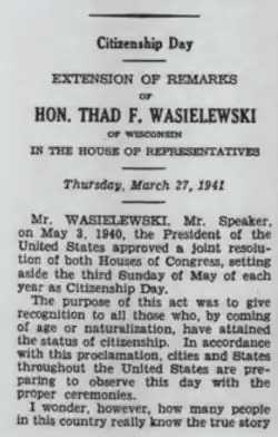 - ^ Congressional Record, H1941, Appendix to the Congressional Record, p. A1473, Extension of Remarks of Hon. Thad F. Wasielewski of Wisconsin, March 27, 1941, RE: Citizenship Day