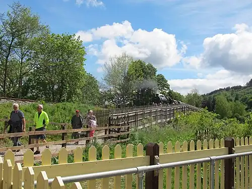 Corwen East station was opened on 22 October 2014 as the temporary western terminus of the Llangollen Railway.[1] The first train was a private service for supporters of the Corwen Appeal.[1] The first public service trains to Corwen East ran throughout the week commencing 27 October 2014 and at weekends until 9 November 2014. These first trains were considered a success, with nearly 4000 passengers travelling during the first ten days of trains to Corwen East.