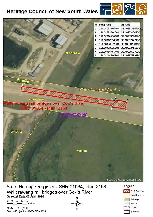 - ^ a b c d e f g h i j k l m n o "Wallerawang rail bridges over Cox's River". New South Wales State Heritage Register. Department of Planning & Environment. H01064. Retrieved 2 June 2018.