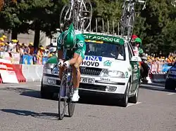 Thor Hushovd riding in front of the Crédit Agricole team car, when winning the prologue in the 2006 Tour de France