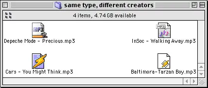 The key difference between extensions and Apple's system is that file type and file ownership bindings are kept distinct. This allows files to be written of the same type - TEXT say - by different applications. Although any application can open anyone else's TEXT file, by default, opening the file will open the original application that created it. With the extensions approach, this distinction is lost - all files with a .txt extension will be mapped to a single text editing application of the user's choosing. A more obvious advantage of this approach is allowing for double click launching of specialized editors for more complex but common file types, like .csv or .html. This can also represent a disadvantage as in the illustration above, where double clicking the four mp3 files would launch and play the files in four different music applications instead of queuing them in the user's preferred player application.