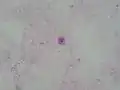 | Micrograph of cryptococcosis showing the characteristically thick capsule of cryptococcus. Field stain. | |