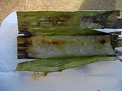 Some of the most well known local specialties are kelaguen, a Chamorro dish consisting of chicken, shrimp, fish or beef marinated in a mix of lemon juice and fresh coconut,[4][5] red rice made with annatto[6] and kå'du fanihi, a soup made of fruit bat or flying fox[7] and Guyuria cookies.[8] The red rice is hineksa’ aga’ga, is made by cooking rice in annatto broth, giving it a deep orange color.[9] Other noted foods include lumpia (spring roll), shrimp patties, and Spam musabi, which is grilled Spam with pickled daigo radish wrapped in nori.[9] Apigigi’ is a Chamorro dish in which roasted coconut is wrapped in banana leaf.[10] The shrimp patties, or buñelos uhang, are a sort of shrimp fritter, with a mix of shrimp, vegetables, and batter which are then deep fried.[11]