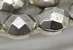 The basic design of cut steel jewellery is a thin metal baseplate onto which closely placed steel studs were riveted or scewed.[3][4] The baseplate could be made from various metals such as brass, tin or silver alloys.[3] Early cut steel consisted of individual steel studs that had been polished and inserted into metal frames.[1] More complicated designs used multiple baseplates held together by small bits of metal.[3] In the early 19th century the manufacturing process shifted towards using stamped strips in place of individual steel studs.[1] The idea behind the design was that the polished steel faces would catch the light and sparkle in a similar way to the then highly fashionable diamonds.[3]