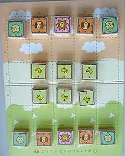 Dōbutsu shōgi (どうぶつしょうぎ; "animal shogi") is a small shogi variant for young children. It was invented by women's professional shogi player Madoka Kitao (北尾 まどか, Kitao Madoka), partially to attract young girls to the game. The pieces were designed by fellow women's professional shogi player Maiko Fujita (藤田 麻衣子, Fujita Maiko).[1] It is played on a 3×4 board and generally follows the rules of standard shogi, including drops, except that pieces can only move one square at a time, and the king reaching the enemy camp as an additional way to win the game.