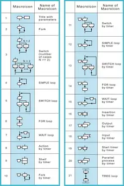 The basis of the graphical syntax is a graphical alphabet. Graphical elements ("letters") of the DRAKON alphabet are called icons (not symbols). DRAKON also has macroicons. Macroicons are the graphical words of the DRAKON language; they consist of icons. There are 27 icons and 21 macroicons in the DRAKON language.