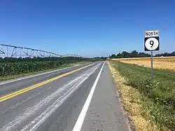 U.S. Routes that run north–south have odd numbers, increasing from east to west, while those that run east–west have even numbers, increasing from north to south. Major north–south U.S. Routes have numbers ending in 1 while major east–west U.S. Routes have numbers ending in 0.[5] Three-digit U.S. Routes serve as branches of their parent route.[7] As such, U.S. Route 13 (US 13) runs north–south through the entire length of Delaware while US 40, a major U.S. Route running from Utah to New Jersey, passes east–west through northern New Castle County. US 113 serves as a branch of US 13 in the southern part of the state. US 9 is an exception to the numbering pattern as it runs east–west across Sussex County, though the route runs north–south in New Jersey and New York.[6]