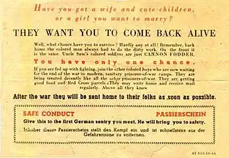 The attempt to exacerbate relations between allies is one method of diverting hatred from an enemy and was attempted by both the Allied and Central Powers in World War I.[2]: 167–168 The Germans made efforts to dig up historical animosity between the French and British, using such themes as the British were just letting the French bleed for them and the British intended to stay on French soil, and they offered a German-French alliance against the British and to expand French colonial domain at the expense of the British Empire.[2]: 167–168