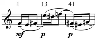 The piece proceeds to outline new tritones, D–G♯, D♯–A, and then pauses, in measures 13–14, B♭–E, which is part of C3, "right back where he had started", however, "the relation between the two tritones of C31 becomes not less but more ambiguous".[9] He sees the close of the first section as the attainment of the e–c♯ missing from the E–G of bars 13–17. However, the B which divides G♯–D require an F, "if we assume that the G♯–B–D collection represents an incomplete diminished-seventh chord, that the work is based on structural relations derived from the interval-3 cycle, and that this implies a tendency for each partition of the cycle to be completely represented".[4]