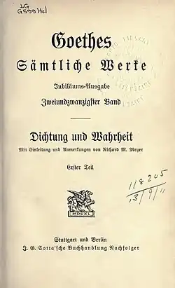 Aus meinem Leben: Dichtung und Wahrheit (From my Life: Poetry and Truth; 1811–1833) is an autobiography by Johann Wolfgang von Goethe that comprises the time from the poet's childhood to the days in 1775, when he was about to leave for Weimar.