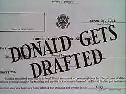 Donald Gets Drafted is a 1942 American animated short film produced by Walt Disney Productions and released by RKO Radio Pictures.[1] The cartoon has Donald Duck being drafted into the U. S. Army during World War II and follows his introduction to military life. The film was directed by Jack King and introduced the song "The Army's Not the Army Anymore" by Carl Barks and Leigh Harline. It was also one out of two shorts in the series that featured Donald's drill sergeant hat in the opening headshot (with the other being his following short Sky Trooper). The voice cast includes Clarence Nash as Donald, John McLeish as an officer, and Billy Bletcher as Pete who is Donald's drill sergeant.
