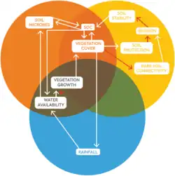 Climate change and human activities are causing land degradation in drylands. These factors have led to increasing droughts, desertification and soil erosion, which decreases biodiversity, soil fertility and carbon sequestration in these regions. This has negative impacts on local agriculture and food security.[6][7] Drylands ecosystems also feature climate tipping points.[8]