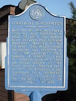 The Binghamton Ferry, permanently anchored at the Binghamton Shopping Plaza, was built in 1904–1905 by Newport News Shipbuilding and Dry Dock Company, Newport News, Virginia.[37] The only double-ended steam-powered ferry boat still on the Hudson River, the Binghamton ferried passengers from New Jersey to Barclay Street in Manhattan for many years[81] and was retired in 1967.[45]