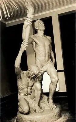 From 1940 to 1952, Grøn was in a relationship with Silvio Turcios, known as Bill. He was a boxer and fireman, and because of his physique, became her model for several sculptures, including the muscles for the athletes of El Relevo. According to her biographer, José Vivó, The Relay is known internationally as a symbol for the transfer of wisdom and knowledge.[6] Grøn held her first solo exhibit at the National Palace of Culture in 1953, exhibiting large Costumbrismo sculptures of figures and several nudes.[2] For the centennial celebration of the Battle of San Jacinto, she sculpted Andrés Castro Estrada, which was installed at the Hacienda San Jacinto in 1956.[1] In 1958, she produced a sculpture of the head of journalist Gabry Rivas and that same year, she was decorated with the Order of Rubén Darío by the government of Nicaragua. The following year, she completed a monument dedicated to mothers, commissioned by historian Julián N. Guerrero. The statue, Monumento a la Madre was installed in Boaco.[7]