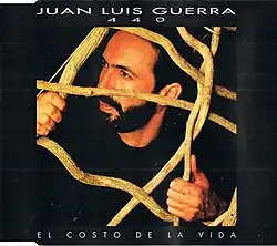 "El Costo de la Vida" was released as the album's third single in 1992 by Karen Records.[20][21] The track was included on Guerra's greatest hits album Grandes Éxitos Juan Luis Guerra y 440 (1995).[22] He performed the track live as part of the set list for the Areíto Tour (1993).[23] AllMusic editor Jason Birchmeier praised it as a "witty song with a sharp socio-political edge unlike anything Guerra had written to date, let alone released as a single".[3] The Los Angeles Times critic Enrique Lopetegui called the track a "biting but gentle critique on the economic situation of Latin America".[23] John Lannert of the Sun-Sentinel stated that the song "reveals a South African melody layered over a thumping merengue beat".[10] Larry Birnbaum wrote for Newsday that Guerra "translates Zairean soukous into hip-wiggling merengue".[24] Similarly, the Rolling Stone editor Daisann McLane noted the artist "transforms a soukous by Zaire's Diblo Dibala into a bubbly merengue romp".[1]