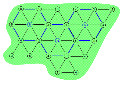 Six-phase heating consists of six electrodes in a hexagonal pattern with a neutral electrode in the center of the array. The six-phase arrays are outlined in blue in Figure 2 below. Once again the contaminated area is depicted by the green shape while the electrodes are depicted by the numbered circles. In a six-phase heating pattern there can be hot spots and cold spots depending on the phases that are next to each other. For this reason, six-phase heating typically works best on small circular areas that are less than 65 feet in diameter.