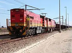 In South Africa on the Sishen–Saldanha Orex line, Class 9E and Class 15E electric locomotives run in mixed consists with GE Class 34 series (Classes 34-000, 34-400, 34-500 and 34-900) and Class 43-000 diesel-electric locomotives to haul the 342-wagon and almost 4-km long iron ore trains. Although this line is completely electrified with high voltage 50 kV AC overhead lines, electrical sub-stations are located very sparsely with large gaps between each other, which can cause huge voltage drops, so their power is insufficient to supply only electric locomotives in sufficient quantity to pull such a long and heavy trains, but the partial usage of diesel locomotives allows to solve this problem[49][50] Each Class 9E or Class 15E electric locomotive is equipped with controls for diesel locomotive power equipment and serves as the master of each mixed consist, controlling its respective diesel-electric companions by means of a Slimkabel (smart cable). Each locomotive set usually consists of two or three locomotives, including one or two Class 9E or 15E electric and one or two Class 34 or 43-000 diesel-electric locomotives. In effect, each ore train is therefore made up of three separate 114-wagon trains consisted together, with the locomotives of all three trains and the pusher locomotive at the rear end all controlled by means of a Locotrol radio distributed power control system by one crew in the leading electric locomotive.[49][50][51]