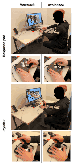 The approach and avoidance task. The top image depicts the zooming-out effect for avoidance and the bottom image the zooming-in effect for approach (as indicated by the arrows on the computer screen). The smaller images exemplify the approach and avoidance task performed by participants when using either the response pad or the joystick.