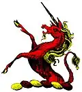 The recorded coat of arms for the Every family of Wycroft Castle (granted 1604) is or, four chevronels gules; the crest being a demi-unicorn couped gules, maned, tired, hoofed or. [18] The Baronets of Egginton add the Red Hand of Ulster as a blazon to denote their title, and have as a crest a unicorns head couped proper.[19]