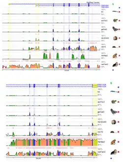 According to the results, there are 14 exons within FAM149A, which are conserved in the monkey, dog, mouse, and opossum. The chicken, frog, and fish show little to no conservation. Within the first 1000 base pairs prior to the start of the transcription, there appears to be no notable conservation across species. Only the dog contains what is considered as an Evolutionary Conserved Region (ECR).[12]