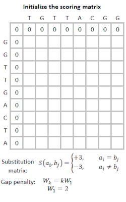 - This step uses a banded Smith–Waterman algorithm to create an optimised score (opt) for each alignment of query sequence to a database(library) sequence. It takes a band of 32 residues centered on the init1 region of step2 for calculating the optimal alignment. After all sequences are searched the program plots the initial scores of each database sequence in a histogram, and calculates the statistical significance of the "opt" score. For protein sequences, the final alignment is produced using a full Smith–Waterman alignment. For DNA sequences, a banded alignment is provided.
