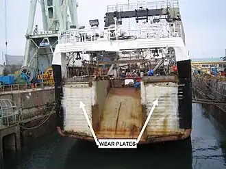 |  Wear plates fitted over stern of Alaska Ranger, shown in 2005. Stern ramp in the center allowed nets to be launched into the sea and then hauled on board with their catch. | |