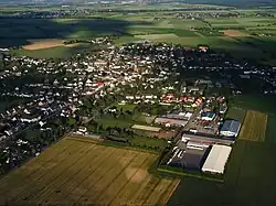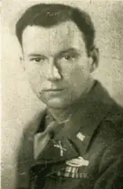 Lt. Bowman exclaimed, "The hell with the tanks; we will take this damn town without them!" There was just one route to the main point of resistance, about 200 yards over a wide-open field. A train track was on the left and parallel to their line of attack. Along this track, several enemies were dug in; Fox company suffered severe casualties before these threats were eliminated. A few yards from the factory, Lt. Roger T. Duncan was wounded.[32] 2nd Platoon suffered significant casualties; Pfcs William T. Puhl and Daniel G. Dailey were fatally wounded, and S-Sgt Wade R. Peeler and Pfc Billie Brown were wounded during the opening exchanges of fire. Many members of the 1st Platoon were killed or wounded, Pfcs William C. Crates and Rosario J. Hussereau were killed, and S-Sgt Oren D. Armentrout, Cpl. Fredrick A. Crowthers, and T-5 Joseph Fanaras were wounded. T-5 Clarence F. Wells, a bazooka man lying flat on his stomach, had a bullet penetrate the front of his helmet, nick his wool hat, and emerge from the back of his helmet.[32] Finally, T-5 Gilbert E. Wunrow could direct the tank support forward; they progressed for about 100 yards before stopping. They fired 75 mm rounds into the town's buildings to drive the snipers away. S-Sgt Edward M. Louchlin, Pfc Jamie E. Smith, and T-4 Charles E. Messick from the 3rd Platoon were also killed before the town was cleared.[32][34]