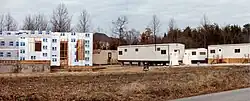 A volunteer photo shows the foundation and walls of the future museum. Trailers in the background were used to hold student classes on site while they constructed the building as part of their curriculum.
