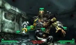 At the beginning of the game, the player can customize their character's physical appearance by choosing their gender and race.[4][5] They can then allocate points into seven primary attributes: strength, perception, endurance, charisma, intelligence, agility, and luck.[5] These attributes are known as S.P.E.C.I.A.L. stats, and range from 1 to 10.[3]: 4  Additionally, there are 13 secondary attributes whose point totals are affected by S.P.E.C.I.A.L. stats: barter, big guns, energy weapons, explosives, lockpick, medicine, melee weapons, repair, science, small guns, sneak, speech, and unarmed.[3]: 10  If the player has a high charisma stat for example, then they will be more proficient with the barter and speech skills at the beginning of the game.[3]: 6  The player can add more points into skill stats whenever they earn enough experience points to level up.[5] Experience points can be earned through several methods, such as killing an enemy or completing a quest.[6] When the player reaches a new level, they can select a perk, which is a permanent beneficial upgrade.[5] For example, the perk Master Trader reduces the price of items sold by vendors by 25 percent.[3]: 18