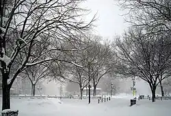 The February 9–10, 2010 North American blizzard was a winter and severe weather event that afflicted the Midwest, Mid-Atlantic and New England regions of the United States between February 9–11, 2010, affecting some of the same regions that had experienced a historic Nor'easter just three days earlier. The storm brought 10 to 20 inches (25 to 51 cm) of snow across a wide swath from Washington, D.C., to New York City, with parts of the Baltimore metro area receiving more than 20 inches (51 cm).[1] This storm began as a classic "Alberta clipper", starting out in Canada and then moving southeast, and finally curving northeast while rapidly intensifying off the New Jersey coast, forming an eye. The National Weather Service likened this storm to a Category 1 hurricane: "Winds topped 58 mph over part of the Chesapeake Bay, and 40 mph gusts were common across the region as the storm's center deepened and drifted slowly along the mid-Atlantic coast". The storm system, in conjunction with the earlier storm, has been nicknamed "Snoverkill."