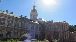 Construction of the southern wing of the monastery building, from the Holy Trinity Cathedral to the southern boundary of the monastery, began in 1725, overseen by Leonard Theodor Schwertfeger.[1] Construction stalled in 1730, and only resumed in 1741 under Pietro Antonio Trezzini.[2] The two-storey wing was finally completed under the auspices of Ivan Rossi in 1748. The south-eastern corner continued the style of the north Dukhovsky wing, and like that wing, was finished with a two-storey church, laid down on 9 August 1745, and intended to be the symmetrical counterpart of the Annunciation Church.[1][3][4] Construction of the church lasted for seven years, with further work to attach a staircase carried out between 1755 and 1761 by M. D. Rastorguev.[1][5] The decoration was completed by 1766.[2] As completed the church building contained two churches, one on the ground floor and one on the upper floor.[3] The icons were painted by Aleksey Antropov.[1] The churches were only consecrated in 1770; the upper one in the name of Holy Prince Feodor of Yaroslav, brother of Saint Alexander Nevsky; and the lower one in the name of Saint John Chrysostom.[1][2][3]
