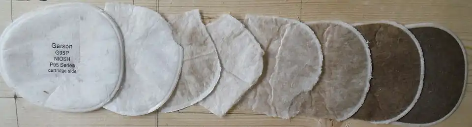 27. ^ Lee, Byung Uk; Yermakov, Mikhail; Grinshpun, Sergey A. (2005). "Filtering Efficiency of N95- and R95-Type Facepiece Respirators, Dust-Mist Facepiece Respirators, and Surgical Masks Operating in Unipolarly Ionized Indoor Air Environments" (PDF). Aerosol and Air Quality Research. 5 (1): 25–38. doi:10.4209/aaqr.2005.06.0003. Archived (PDF) from the original on 20 January 2022. Retrieved 4 July 2024.