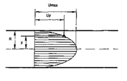 The most commonly used description of flow conditions within the pipe is the flow velocity profile. Fig.(1) shows the typical flow velocity profile for natural gas measurement.[4] The shape of the flow velocity profile is given by the following equation,