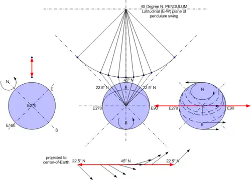 - Using the same projection for the 45° North pendulum with longitudinal swing (Figure 3B) the velocity vector is 1 EVU but the z-component is only 0.707 EVU since the x-y plane is at 45°on one side of the swing (corresponding to the equator). On the other side of the swing the velocity vector is 0.707 EVU in the opposite direction (corresponding to the equator with a tilt of 45° to the x-y plane). The difference between these two vectors is 1.414 EVU.