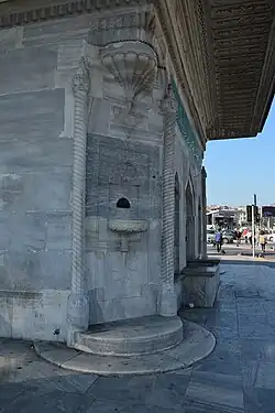 İt features a faucet inside a lancet arch in the middle of each facade over a watering trough to enable for bucket filling, livestock drinking or taking ritual body washing for prayer. The higher-attached faucets over a sink in the four corner facades were designed to spend drinking water for people. In the wall of the main facade, which looks at Bosphorus, there are two semicircular niches on both sides resembling a mosque's mihrab. A number of relief flower motifs as tulips, roses and chrysanthemums in vase adorn the structure. Each of the eight corners of the fountain features a Solomonic column topped with a Corinthian order capital. At the top of the corner facades in between the columns, muqarnas, three-dimensional decorations of Islamic architecture, are placed, which transform the octagon plan of the fountain into a square right under the roof. The wooden roof's eaves features carved ornaments over a cornice encircling the entire structure.[2][3][4][5][6][8][9][10]
