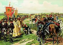 Committed to Catherine the Great's expansion policy, Alexander I issued an ultimatum in April 1812, demanding the evacuation of French troops from Prussia and the Grand Duchy of Warsaw. When Napoleon chose war over retreat, between June 8 and 20, the troops remained in constant motion, enduring arduous marches amid intense heat.[50] Napoleon's primary objective was to defeat the Imperial Russian Army and compel Czar Alexander I to rejoin to the Continental System.[51] From 21 to 22 June 1812, Bonaparte stayed at Vilkaviškis Manor (in Polish: Wilkowiszky). There Napoleon announced the following proclamation:[52]