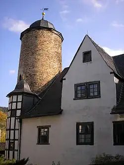 The town of Leutenberg grew up as a result of the castle's presence. The castle was built in three phases: the massive Bergfried (keep) and the east wing, which originated in a freestanding residential tower, are the oldest parts; the north wing was built between 1362 and 1375; and the castle took on its current appearance in a third period of construction in the early 16th century, when the south wing was added and the defensive building reconstituted as a primarily residential castle.[5] Since then, the castle has suffered repeated damage from fires, for example in 1567, 1695, 1726, 1800 and 1934. In the last fire, in 1934, the east, north and west wings were gutted and much of the historic interior was destroyed, including the 17th-century chapel.[5] After rebuilding, the castle was used as part of an educational camp for evacuee schoolboys during World War II, then requisitioned for scientists from Peenemünde;[6] during the Soviet administration and under the German Democratic Republic it was a holiday resort for Zellwolle Schwarza (1947–51), was administered by the State Forestry Service (1952–56) and then became a residence for the Council of Ministers.[1][4] Between 1991 and 1993 it underwent a comprehensive restoration and has since been a specialised dermatological hospital.