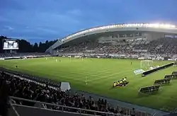 ![]() Aerial view of the seaside Momochi with the Fukuoka Tower and Momochi Seaside Park in the center and with the Fukuoka PayPay Dome to the left side  | |