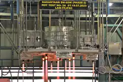 The SMPS carries out orbit injection, circularization burn, on-orbit control, de-boost maneuvering, and service module based abort if necessary during the ascent phase for the Orbital Module.[86] On 20 July 2023, hot test was conducted in final configuration of SMPS in which sixteen RCS thrusters with 100 Newton thrust and five LAM engines with 440 Newton thrust were used. The propellant tank feed system, helium pressurization system, flight-qualified thrusters, and control components were all included in the hot test which simulated the fluid circuit of the SMPS. The combined performance of SMPS was showcased in the first hot test of the Phase-2 test series.[87] Each 440 Newton thrust engine will also be tested individually for longer duration involving various parameters to gain human-rating certification. ISRO has scheduled five additional tests to demonstrate both nominal and off-nominal mission scenarios.[88][89]
