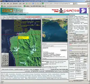 - Satellite imagery and maps. Search for more than 8,000,000 geographic entities worldwide. Different sources merged. Addons like: Google maps, Yahoo images search, geolocated web pages, [...] are driven from the application. It is based on Open Geospatial Consortium standards, and is created with Open Laszlo (open source development platform) and DHTML.