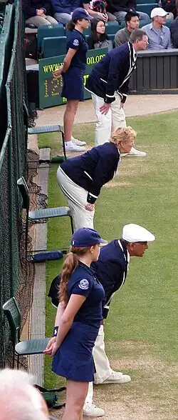 - Ball boy (also ball girl or ballkid): a person, commonly a child, tasked with retrieving tennis balls from the court that have gone out of play and supplying the balls to the players before their service. Ball boys in net positions normally kneel near the net and run across the court to collect the ball, while ball boys in the back positions stand in the back along the perimeter of the arena. Ball boys in the back are responsible for giving the balls to the player serving.[19]