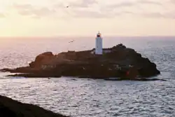 Godrevy (Cornish: Godrevi, meaning small farms) (/ɡəˈdriːvi/ gə-DREE-vee)[1] is an area on the eastern side of St Ives Bay, west Cornwall, England, United Kingdom, which faces the Atlantic Ocean. It is popular with both the surfing community and walkers. It is part owned by the National Trust, and offshore on Godrevy Island is a lighthouse maintained by Trinity House which is said to be the inspiration for Virginia Woolf's novel To the Lighthouse.[2] Godrevy lies within the Cornwall Area of Outstanding Natural Beauty (AONB) and the South West Coast Path runs around the whole promontory. There are several public car parks on the western side where the National Trust owns and operates a café.[3]