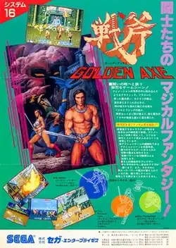 Golden Axe[a] is a 1989 beat 'em up video game developed and published by Sega for arcades, running on the Sega System 16B arcade hardware.[8] Makoto Uchida was the lead designer of the game, and was also responsible for the creation of the previous year's Altered Beast. The game casts players as one of three warriors that must free the fantastical land of Yuria from the tyrannical rule of Death Adder, who wields the titular Golden Axe.