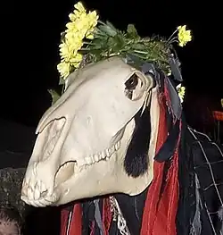 Barbara Spooner in her 1958 article on the Padstow 'Obby 'Oss[15] incorrectly described the 'Obby 'Oss associated with "Old Penglaze" as a "horse's skull held up on a stick by a hide covered or sheet-draped man" without checking the original source written by Richard Edmonds in 1846.[16] Spooner's mistaken assumption about the horse's skull has inspired many skull-on-pole 'beasts' in Cornish folk culture since the creation of Golowan's Penglaz.