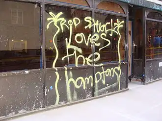 On January 1, 2006, in New York City, legislation created by Councilmember Peter Vallone, Jr. attempted to raise the minimum age for possession of spray paint or permanent markers from 18 to 21. The law prompted outrage by fashion and media mogul Marc Ecko who sued Mayor Michael Bloomberg and Councilmember Vallone on behalf of art students and "legitimate" graffiti artists. On May 1, 2006, Judge George B. Daniels granted the plaintiffs' request for a preliminary injunction against the recent amendments to the anti-graffiti legislation, effectively prohibiting the New York Police Department from enforcing the higher minimum age.[16] A similar measure was proposed in New Castle County, Delaware in April 2006[17] and passed into law as a county ordinance in May 2006.[18]