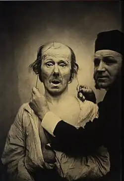 Duchenne was convinced that the truth of his pathognomic experiments could only be effectively rendered by photography, the subject's expressions being too fleeting to be drawn or painted. "Only photography," he writes, "as truthful as a mirror, could attain such desirable perfection."[15] He worked with a talented, young photographer, Adrien Tournachon, (the brother of Felix Nadar), and also taught himself the art in order to document his experiments.[16] From an art-historical point of view, the Mechanism of Human Physiognomy was the first publication on the expression of human emotions to be illustrated with actual photographs. Photography had only recently been invented, and there was a widespread belief that this was a medium that could capture the truth of any situation in a way that other mediums were unable to do.