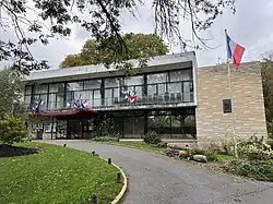 After the Second World War, Évry was identified as a potential new town to accommodate the growing population of Paris. The town council led by the mayor, Michel Boscher, decided to commission a new town hall on what is now Place du Général de Gaulle. The new town hall was designed in the modern style, built in concrete and glass and was officially opened by the Prime Minister of France, Michel Debré, on 29 April 1961.[3] It featured a rectangular concrete box on the first floor, which was glazed, surrounded in concrete, and jettied out over the pavement. There was a blind concrete wall to the right of the main structure.[4][5]