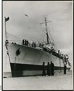 The ship was almost constantly deployed on survey operations in the waters of Australia and New Guinea for the next three years.[5] In 1947, Barcoo conveyed Australian officials to Timor for visits to the governor of Portuguese (East) Timor and the Dutch colonial administrative centre in West Timor.[6] During April 1948, Barcoo and the sloop HMAS Warrego were deployed together for surveying operations off South Australia.[2] On 11 April 1948, Barcoo ran aground at West Beach, South Australia, having been driven ashore by a violent storm.[2][7] Despite attempts to lighten the frigate by removing munitions and stores, the combined efforts of three tugboats were unable to pull Barcoo off the beach.[2] A dredger was brought from Adelaide, which cleared a channel behind the stranded frigate.[2] On the evening of 20 April, over a week after the initial beaching, Barcoo was able to be refloated.[7] Warrego towed Barcoo to Port Adelaide for inspection and repairs.[7]